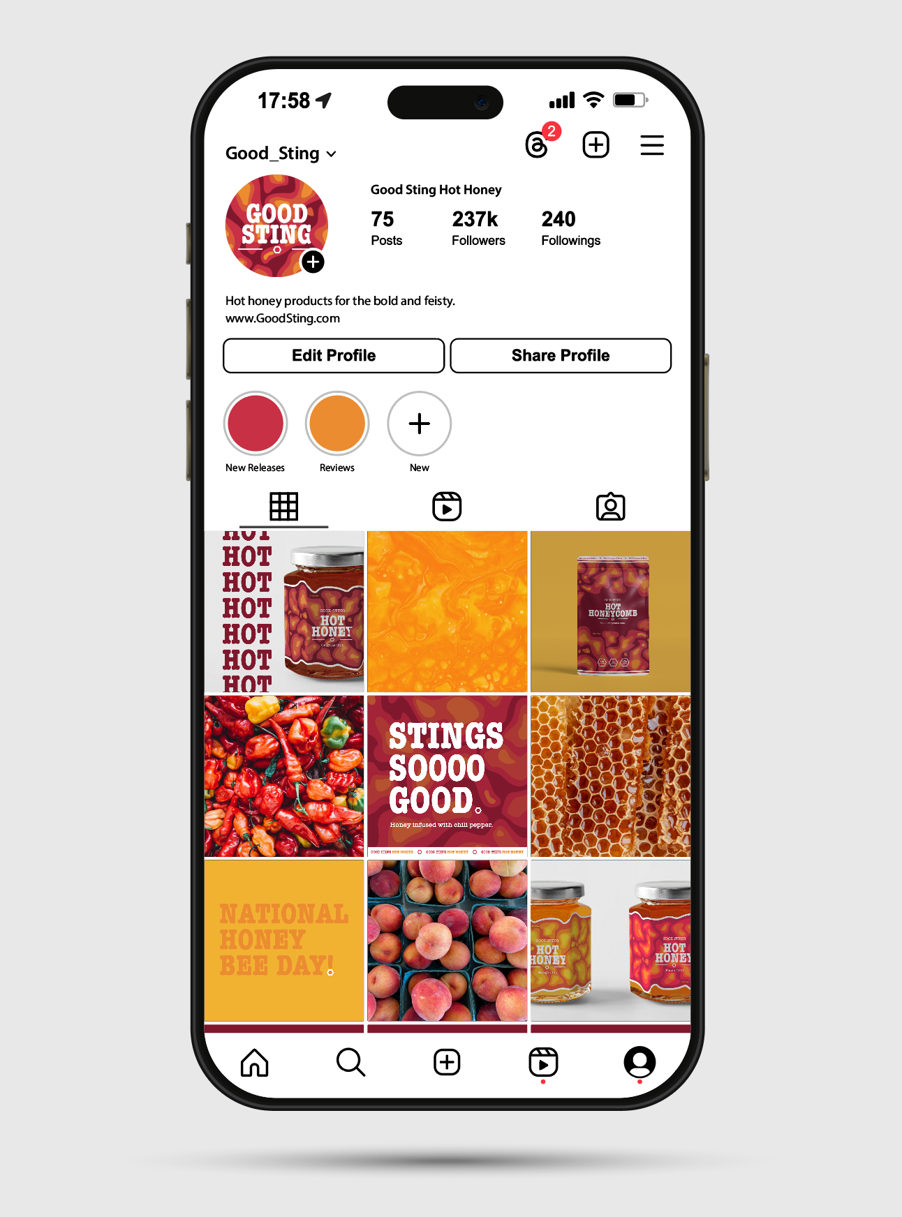 Good Sting is a hot honey brand dedicated to out-of-the-ordinary taste. In addition to an original chili honey, they have a peach and mango flavor in case you want a fruity twist, as well as hot honeycomb bites. Good Sting is funky, fun, and young, conveying the vibrancy of heat through eye-catching graphics that take over the jar.